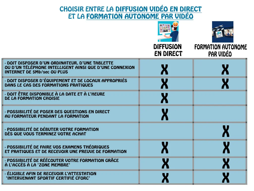 Toutes nos formations vous permettent de faire vos examens théoriques et vos examens pratiques, de recevoir des conseils au besoin, de recevoir des preuves de formation ainsi que de vous qualifier comme ‘INTERVENANT SPORTIF CERTIFIÉ CFORC’.